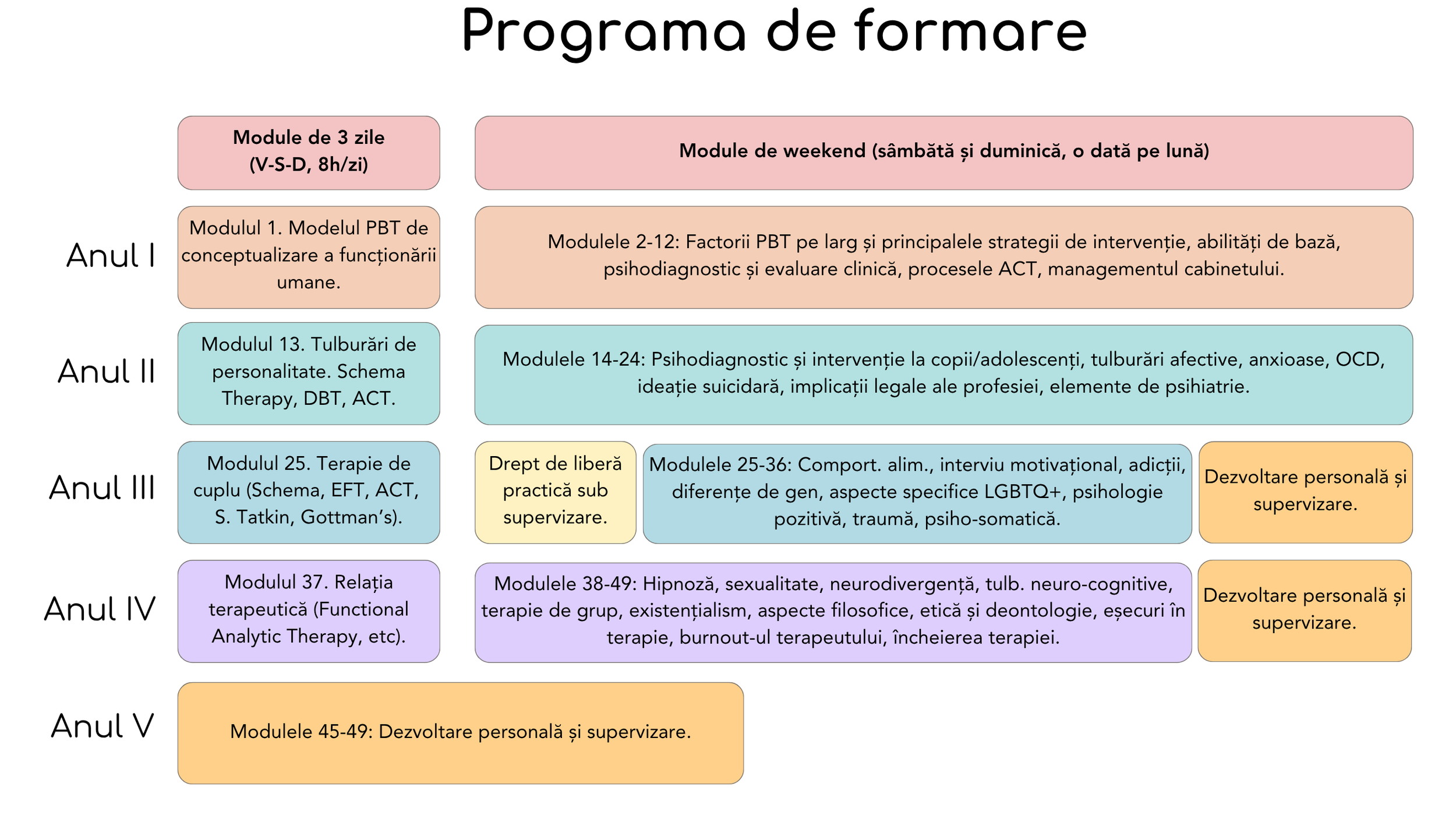 Fiecare an începe cu un modul intensiv (3 zile - 8h/zi), și continuă cu 11 module lunare de weekend.